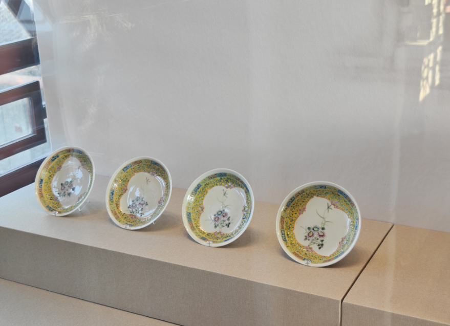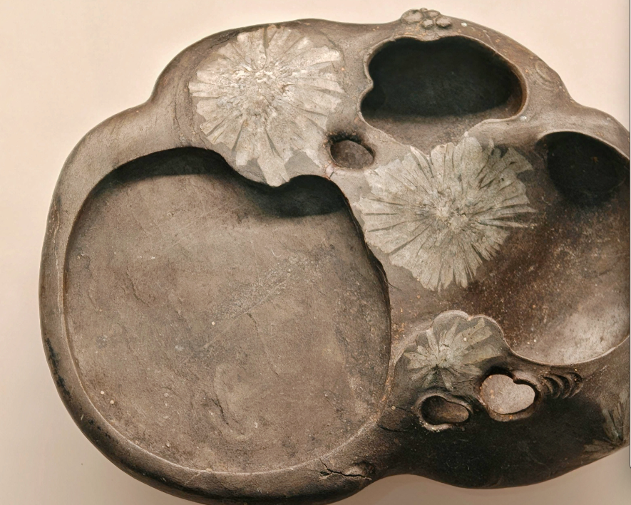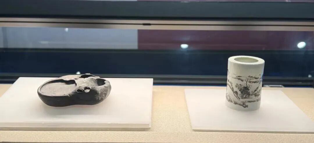 叶挺曾使用的菊花砚与墨彩山水瓷笔筒。
