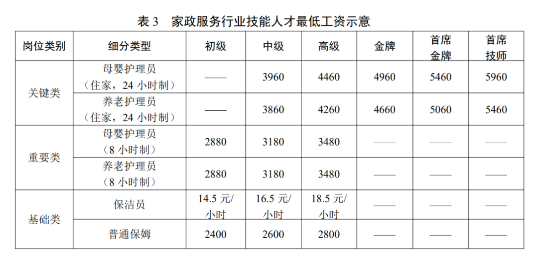 范例对技能人才从事的岗位进行分类,包括关键类的母婴护理员(住家,24小时制)和养老护理员(住家,24小时制);重要类的母婴护理员(8小时制)和养老护理员(8小时制);基础类的保洁员和普通保姆。