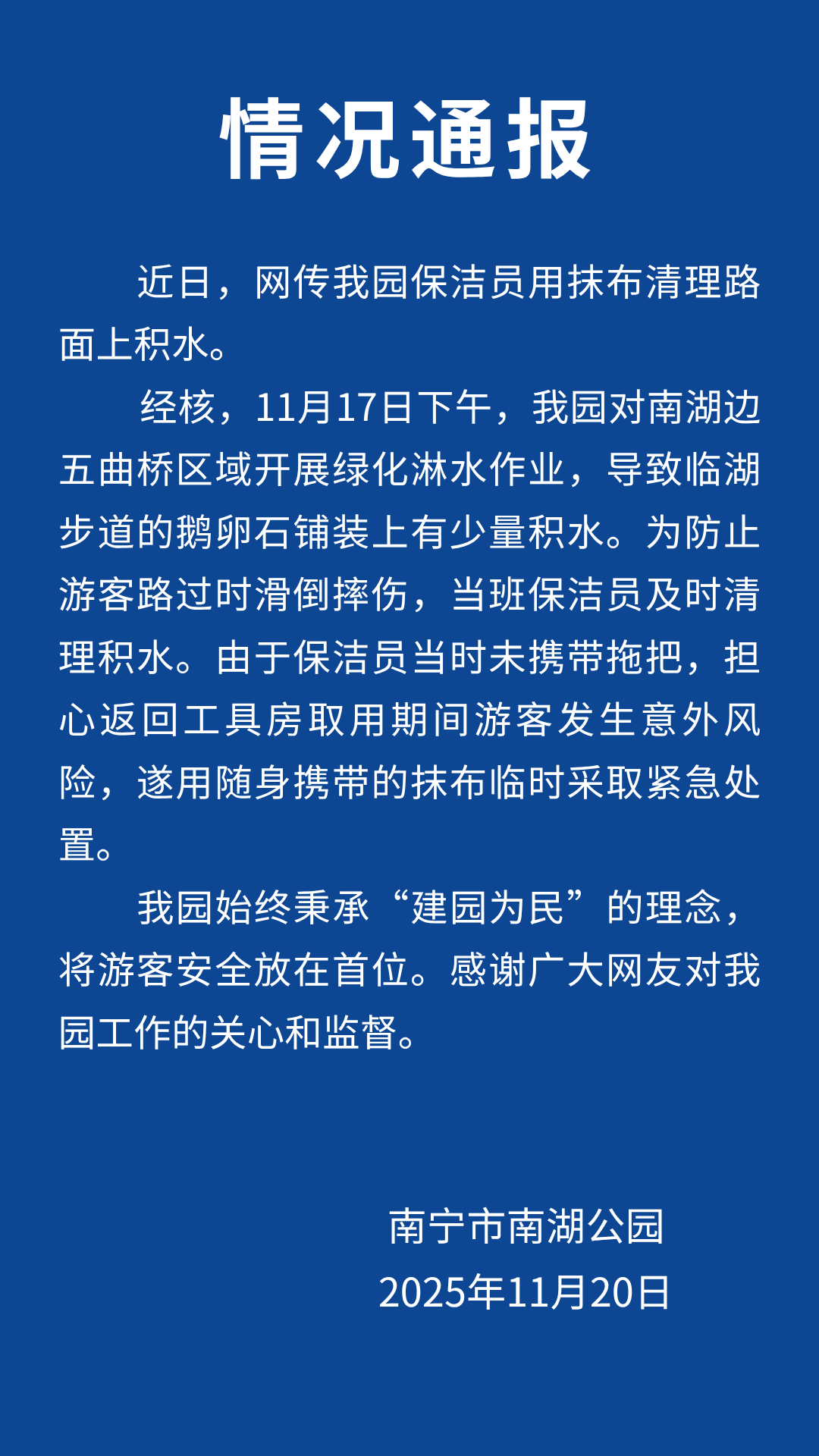 经核,11月17日下午,我园对南湖边五曲桥区域开展绿化淋水作业,导致临湖步道的鹅卵石铺装上有少量积水。为防止游客路过时滑倒摔伤,当班保洁员及时清理积水。由于保洁员当时未携带拖把,担心返回工具房取用期间游客发生意外风险,遂用随身携带的抹布临时采取紧急处置。