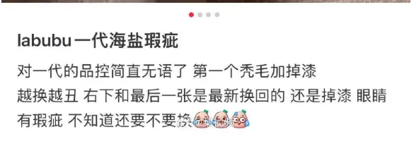 在网上,有不少网友都反映,收到的Labubu出现品控问题。在某社交平台上,“labubu品控差”有超1200条相关笔记。有不少消费者反映收到的Labubu出现歪头、掉漆、开线、秃毛等不同的品控问题。